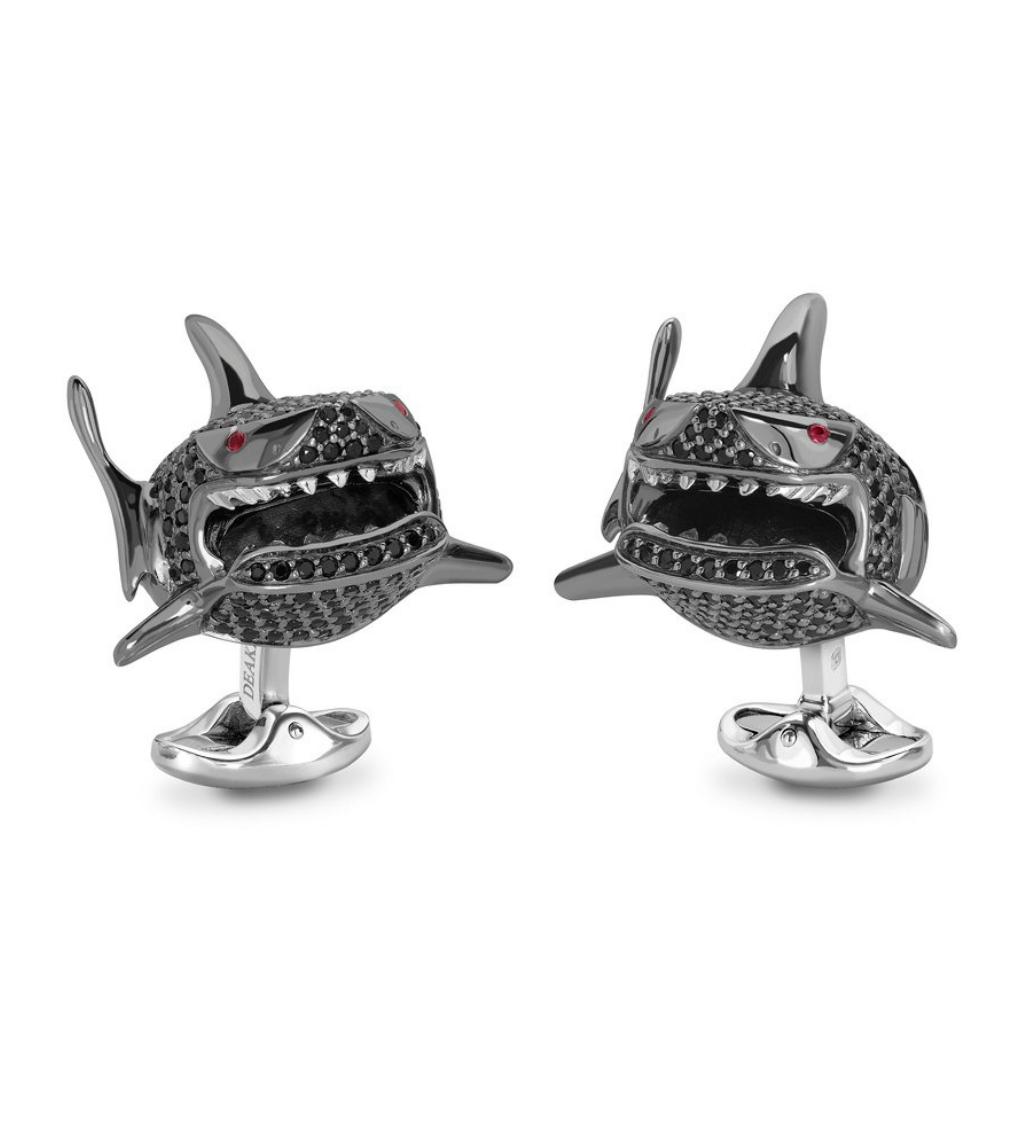 Deakin & Francis always ensure their designs are exclusive and quirky, to make any outfit look unique. Handmade, hand painted and hand finished using traditional methods. Here we present the seriously eye-catching shark cufflinks, encrusted with black spinel stones and red ruby eyes.